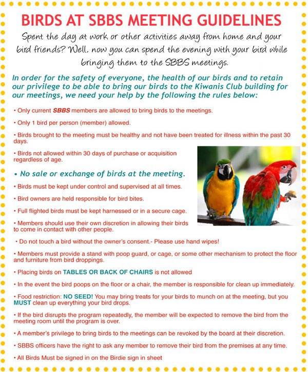 Until further notice, birds are not allowed at meetings due to current outbreak of Newcastles disease